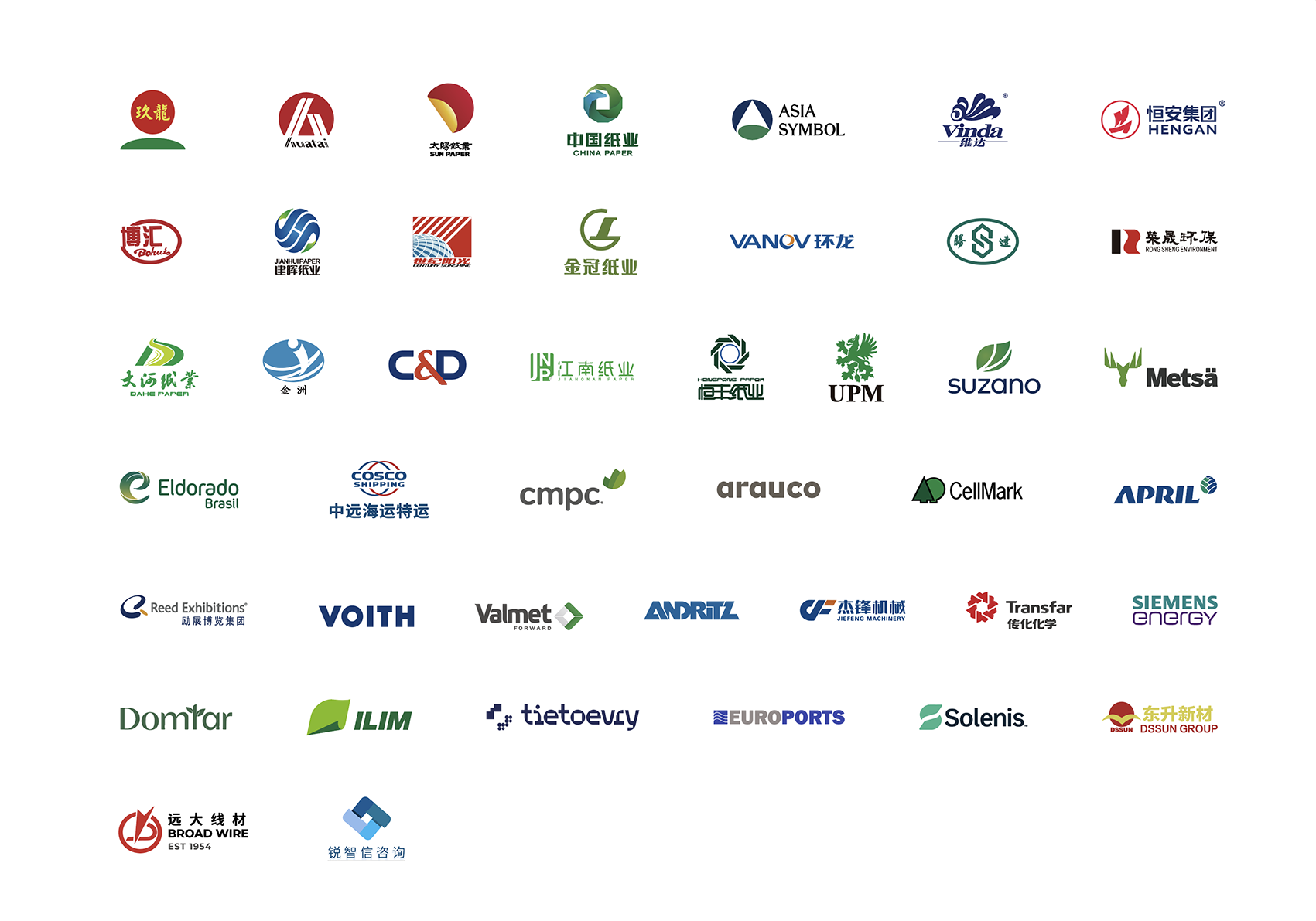 Supporting Partner, Strategic Partner, Exclusive Sponsorship of Annual Meeting, Sponsorship of Dinner, Sponsorship of Lunch and Sponsorship of Reception are the main cooperation programs of Shanghai Pulp Week. Main partners are dominating paper companies from China and regions of Europe, America and Asia as well as representative companies from global pulp suppliers, logistics companies and consultancies etc. They are: Nine Dragons, Huatai Group, Sun Paper, China Paper Coporation, Bohui Paper,Dongguan Jianhui,Vinda, Heng’an Group,Century Sunshine, Vanov,Asia Symbol,Suzano,UPM,Metsä, Eldorado, Arauco, CMPC ,CellMark, Ilim, COSCO, C&D, Domtar,Ilim,Tieto,EuroPorts,Solenis,Dongsheng, FastmarketsRISI,TTO BMA etc.